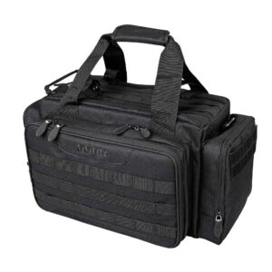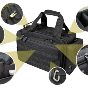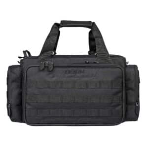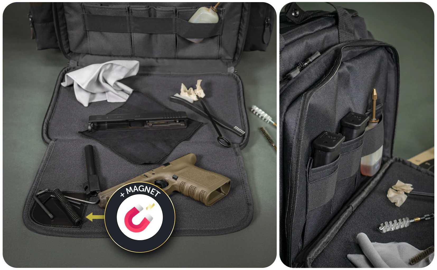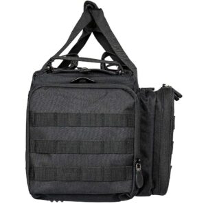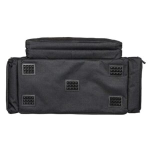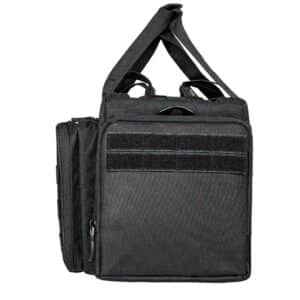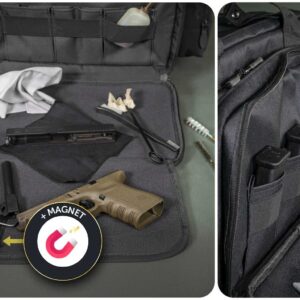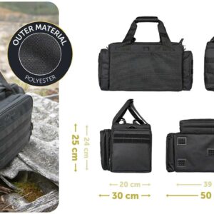La tasca anteriore è suddivisa in 2 scomparti: lo scomparto anteriore comprende tre tasche multiuso, ad esempio per caricatori, munizioni e altri accessori. Il tappetino pieghevole è utile quando si ripone o si smonta l’arma: utilizzare l’angolo magnetico per fissare le piccole parti metalliche. Lo scomparto posteriore con rivestimento interno morbido è utilizzato per riporre, ad esempio, una pistola o un silenziatore. Entrambi gli scomparti possono essere chiusi con un lucchetto opzionale. Misure dell’intera tasca anteriore: circa 36 x 23 x 7 cm.