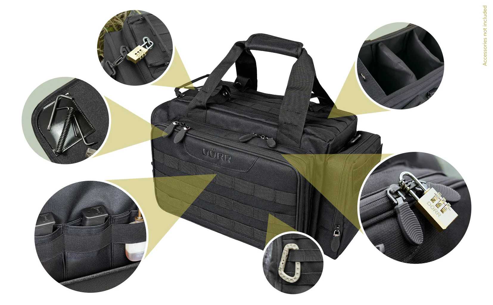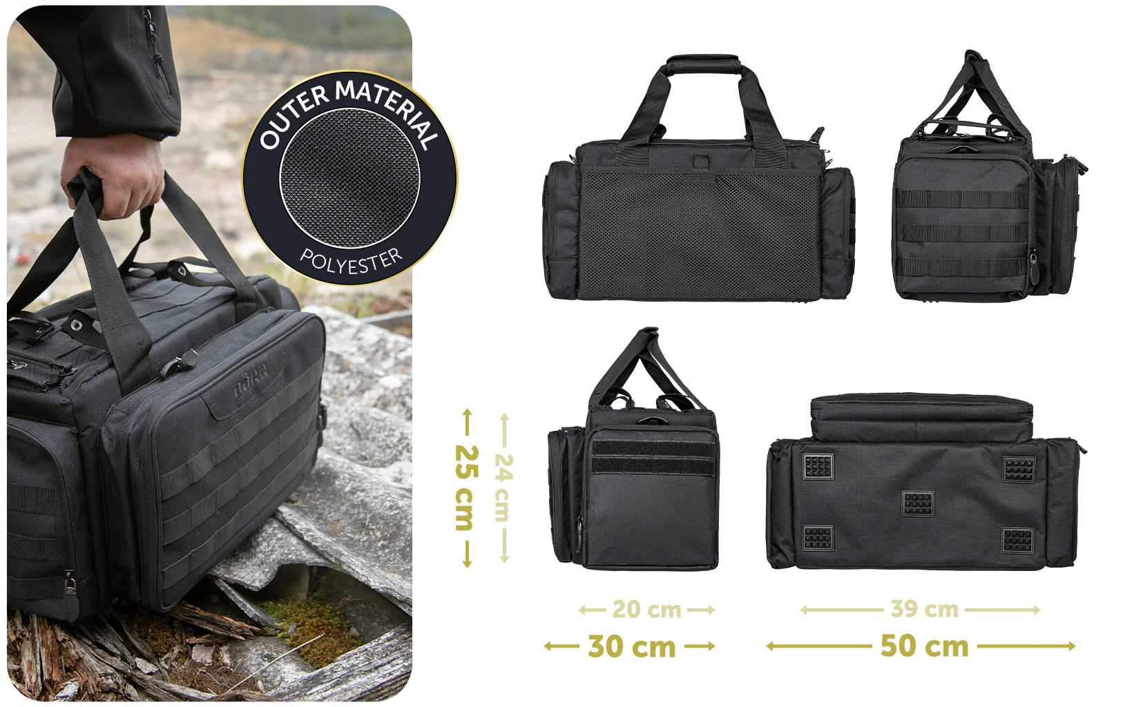 La borsa della serie DÖRR ProTac è estremamente robusta e può essere utilizzata in molti ambiti. Potete riporre le vostre armi da allenamento per gli sport di tiro o trasportare il vostro fucile da caccia bloccato in modo sicuro sul terreno di caccia. Particolarmente utili per il trekking sono le cinghie standardizzate del sistema MOLLE (*) alle quali possono essere fissati molti accessori opzionali compatibili con il sistema MOLLE, come portaborracce, vanghe, corde o tasche per cellulari.
