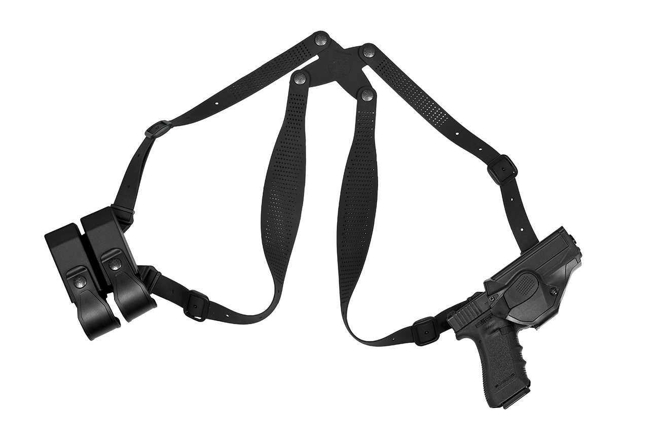 Vite di ritenzione e clip con doppio sistema di frizione. Sicura frontale sganciabile con movimento dito indice. Possibilità di chiusura apertura inferiore. Possibilità di inserimento copertura totale sicura anteriore. Possibilità di inserimento paratia frontale per maggiore sicurezza dell’ arma. Kit ascellare in cuoio morbido, doppia piattaforma modulare per l’ inserimento di più accessori sia tramite ruota dentata sia tramite sistema a viti. Doppio P/caricatore in polimero con pattina regolabile ed amovibile inclusi. Brevetto internazionale. Possibilità di montaggio su Tutti i passanti e Kit Vega Holster. Possibilità di inserimento R.S.A. “Rotating System Accessories” (accessori sistema